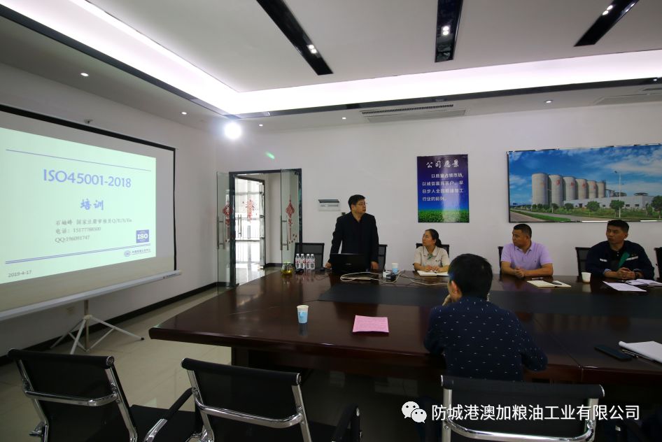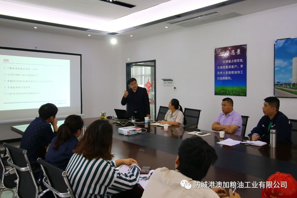 为保证公司ISO45001-2008新版标准转版工作顺利进行,体系持续有效,并提高各级管理人员对新版标准的认识,近日,公司邀请中国检验认证集团石岫峰老师,为澳加粮油的员工们开展了“职业健康安全体系专题培训”。公司总经理张慧、副总经理孙立成、焦山海、各部门负责人及车间班组长等30余人参加培训会。