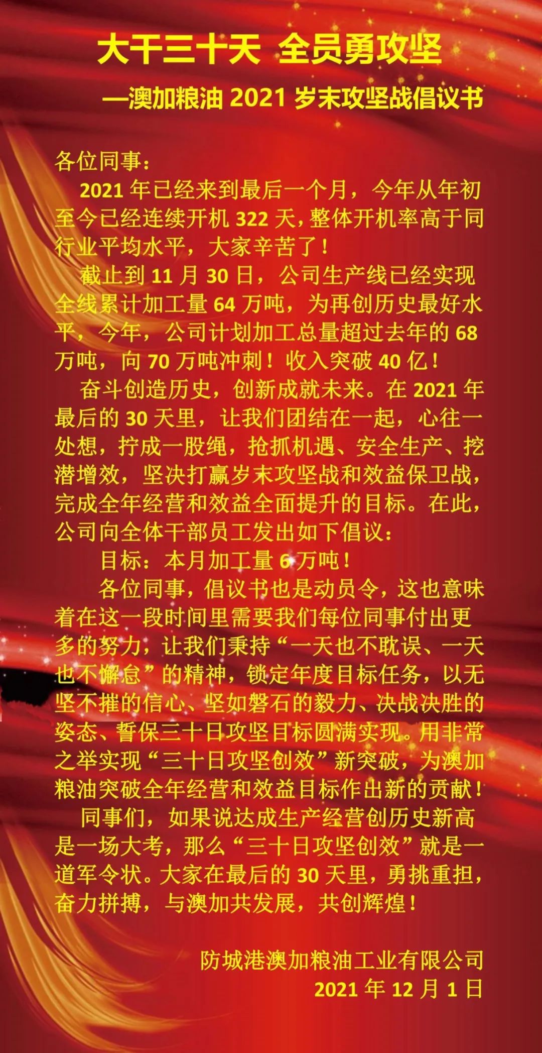大干三十天 全员勇攻坚 ——澳加粮油 2021 岁末攻坚战倡议书