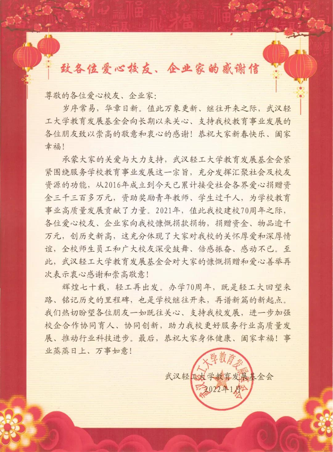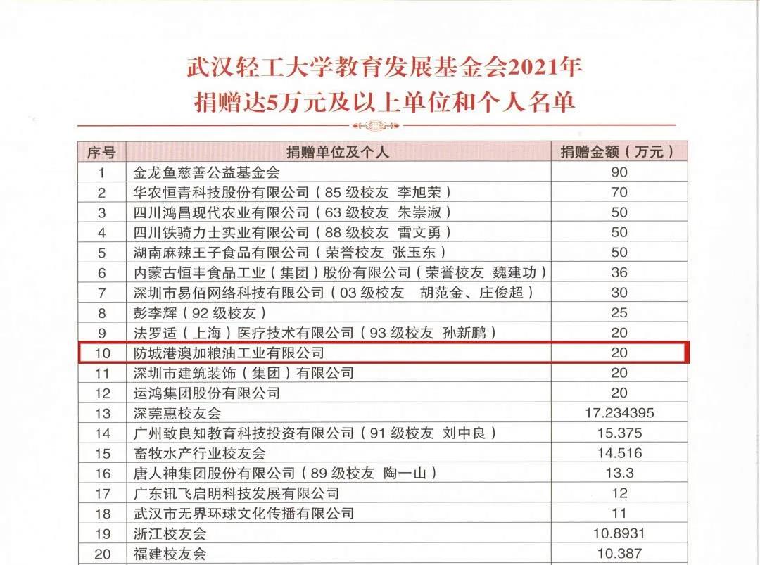 2021年值武汉轻工大学建校70周年之际,澳加粮油以“同进步、共发展”的初心,向武汉轻工大学教育发展基金会捐赠20万元。望更多优秀的学子、教师能有广阔的平台大展身手,以强国之决心,为国家的崛起而不断奋斗!