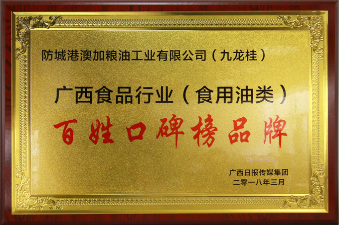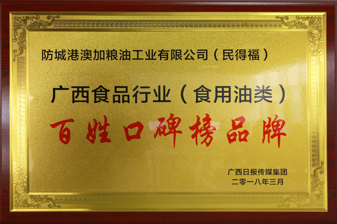 金杯银杯不如百姓口碑,金奖银奖不如群众夸奖。近日,“广西食品行业百姓口碑榜品牌”推选活动落下帷幕。历时3个多月,经过百姓投票和层层推选,最终,澳加粮油食用油品牌“民得福”、“九龙桂”获评广西食品行业百姓口碑榜品牌,赢得百姓的好口碑。
