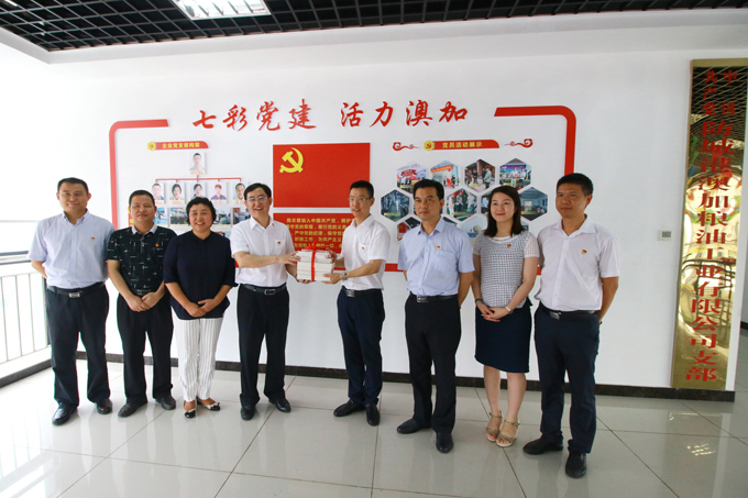 随后,袁国华部长来到澳加粮油党支部党员活动中心,听取了党支部书记杨宏宇关于非公企业党建工作亮点、党建经验的汇报,同时还查看了党支部日常的学习记录,三册三台账等。袁部长强调,要坚持企业发展与党的建设不分离,充分发挥党组织在职工群众中的政治核心和在企业发展中的政治引领作用,助推企业转型升级、爬坡过坎。